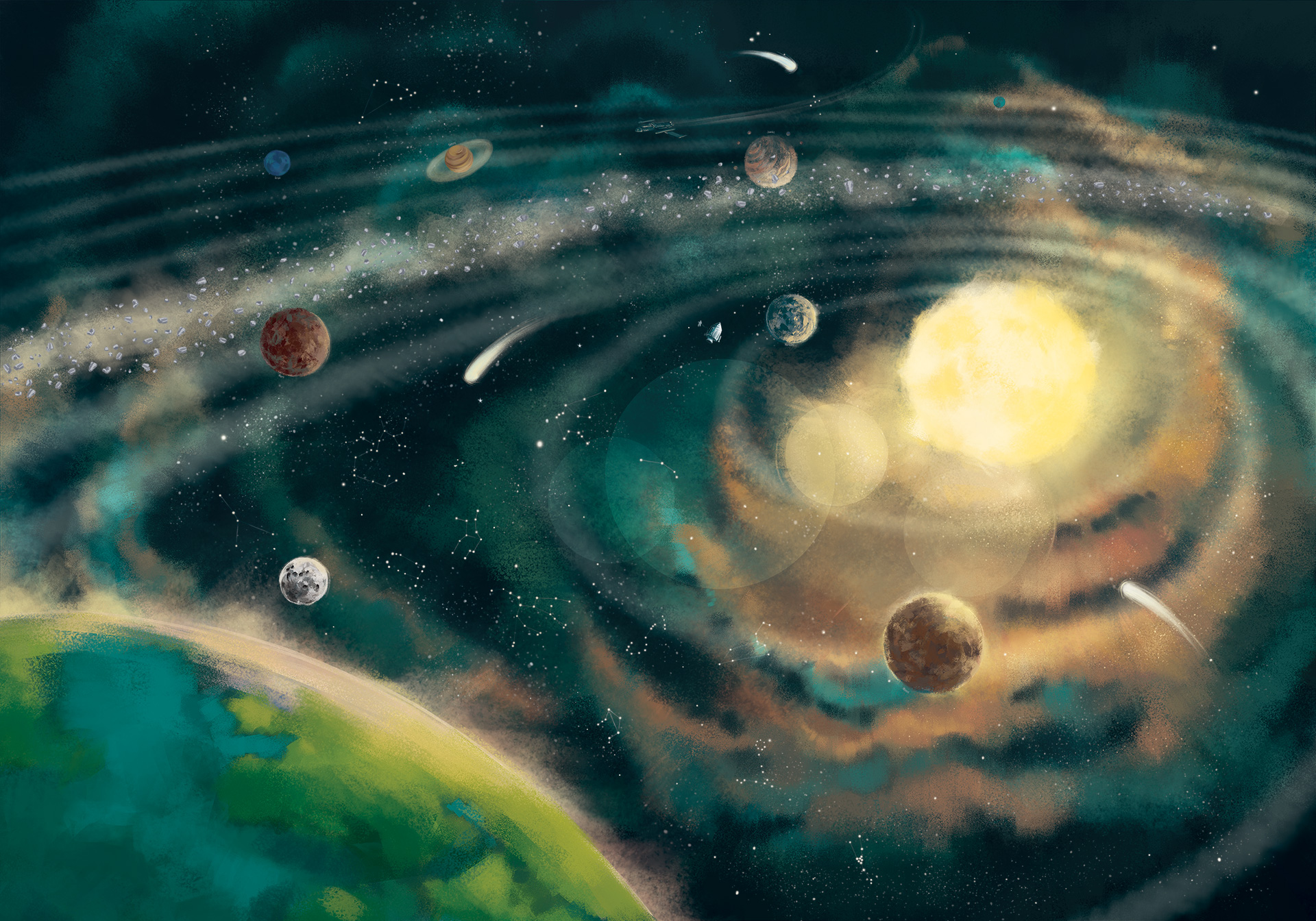 Punkt widzenia zależy od punktu… uniesienia! Patrząc na tę tapetę, dziecko poczuje się, jakby lewitowało nad naszą planetą i właśnie wykonywało zdjęcie, wszystkim planetom Układu Słonecznemu i Słońcu, wokół którego krążą, by utrwalić tę wyjątkową chwilę.