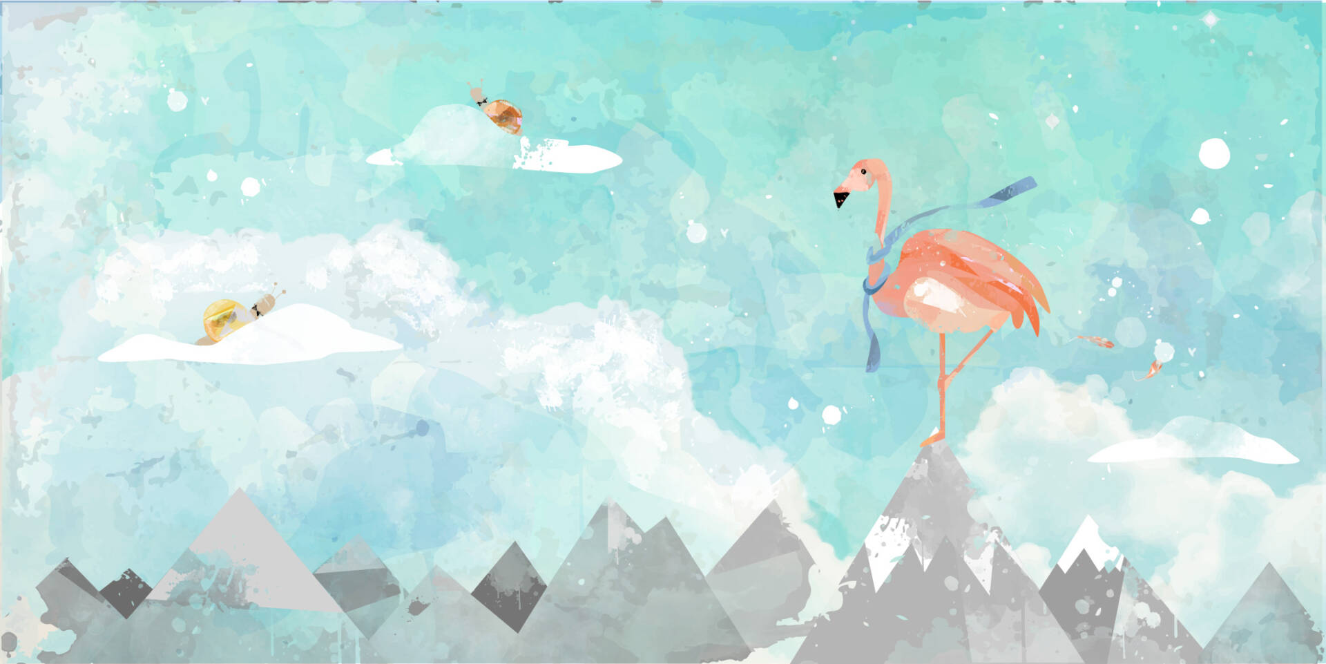 To tapeta, która ma pobudzać wyobraźnię! To właśnie wyobraźnia najintensywniej pracuje u dzieci. Żaden kilkulatek nie uzna tapety z flamingiem maszerującym po górskich szczytach za coś niezwykłego. Ba! Historia z tapety może wręcz stać się pretekstem do wymyślenia własnej wersji wydarzeń, jak to się stało, że flaming jest alpinistą? Skąd bierze dodatki? I co na chmurze robi ślimak?!