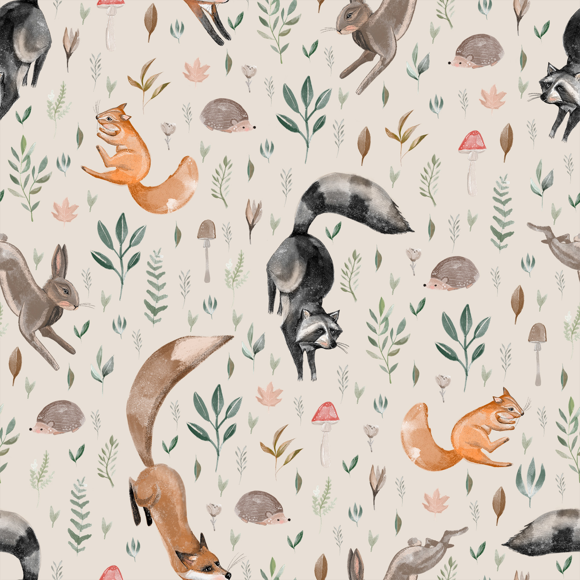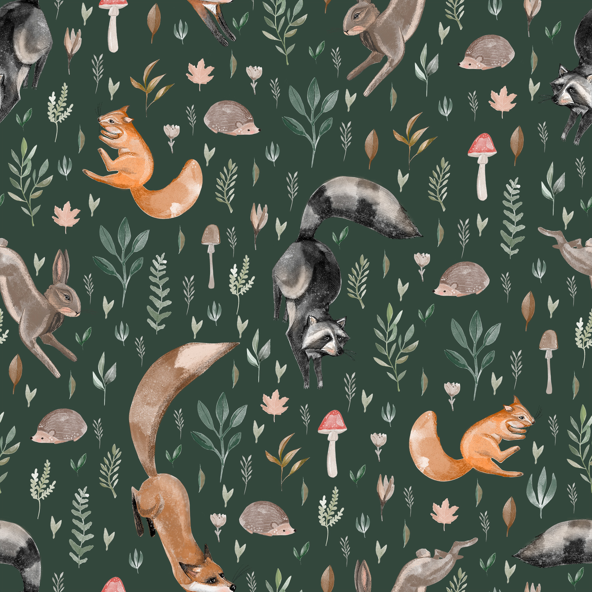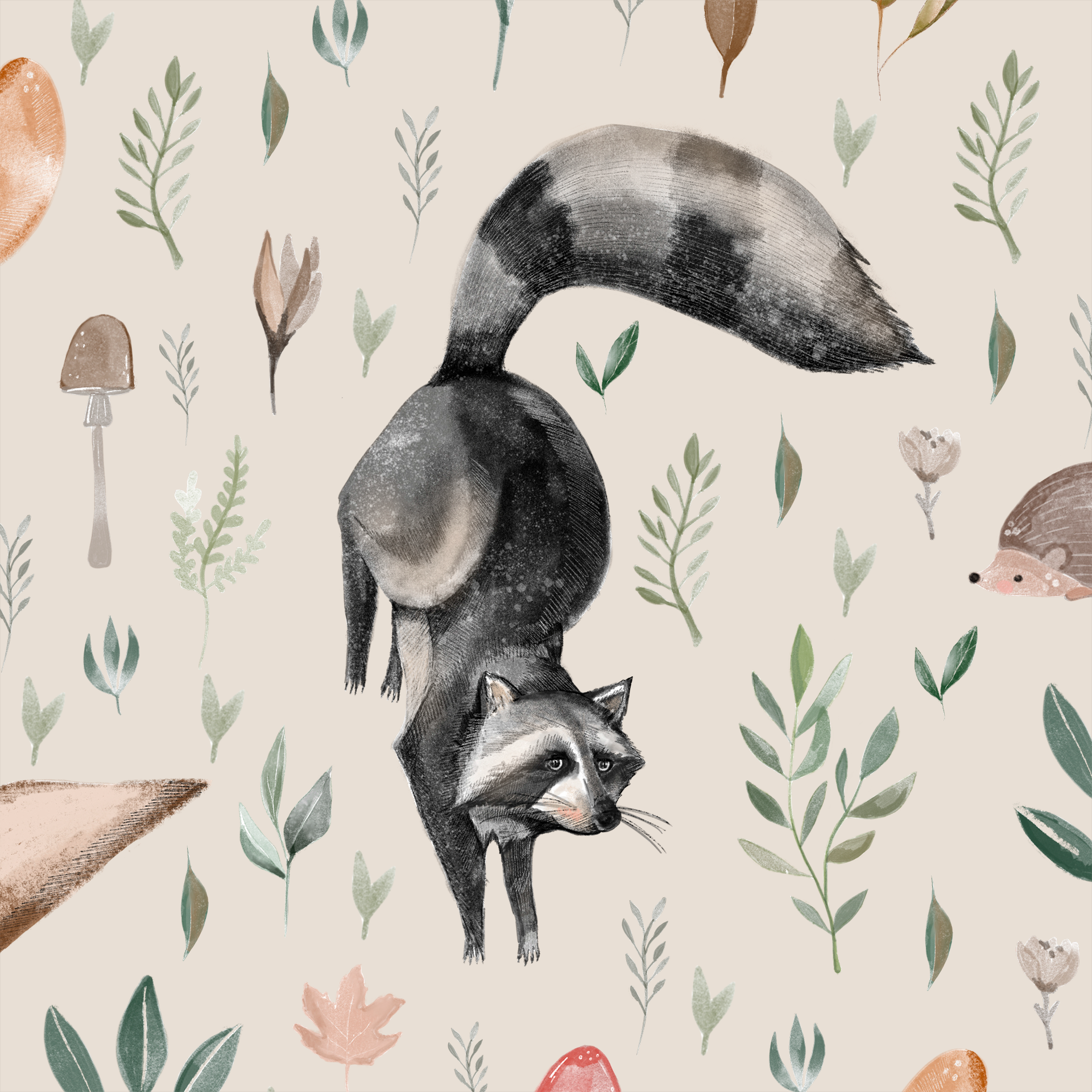 Dzieci kochają zwierzaki, chcą z nimi obcować, poznawać je, dowiadywać się o nich wszystkiego, co tylko się da! Nie zawsze jednak jest to możliwe na żywo, dlatego doskonałym substytutem staje się tapeta. Tak, prosta tapeta z powtarzalnym wzorem, ale pełna zwykłych-niezwykłych leśnych zwierzaków i roślin. Wiewiórka, lis, szop, zając i jeż, a do tego grzyby (często trujące!), liście rozmaitych drzew… Oj, dzieje się na tej tapecie!