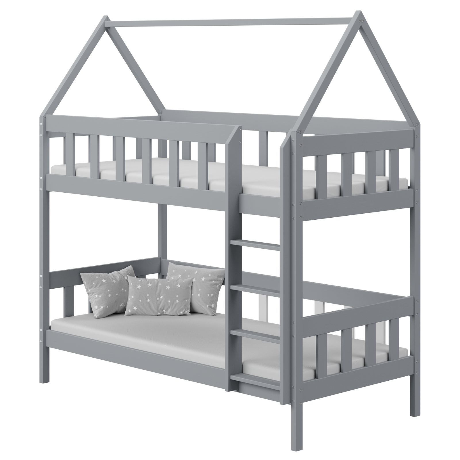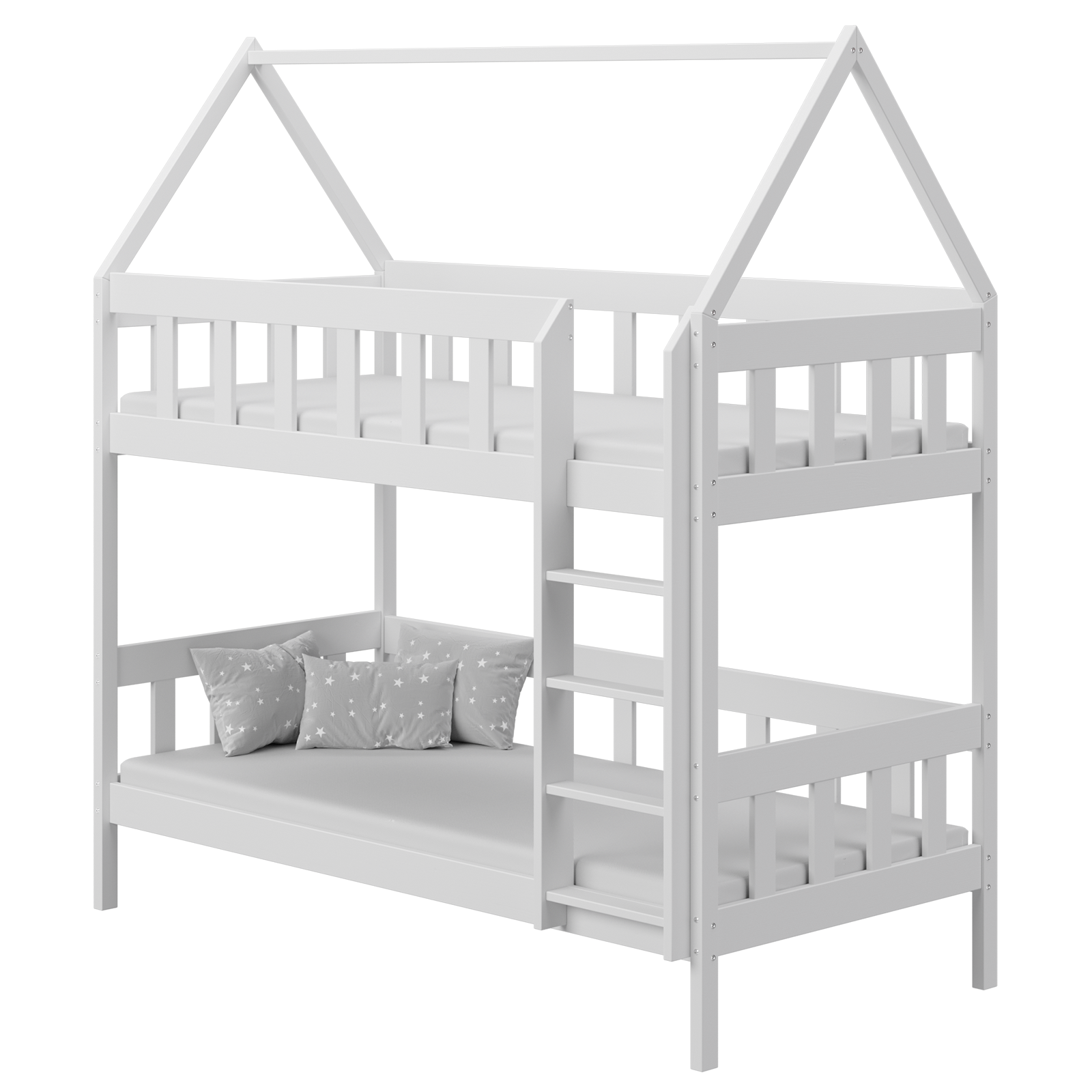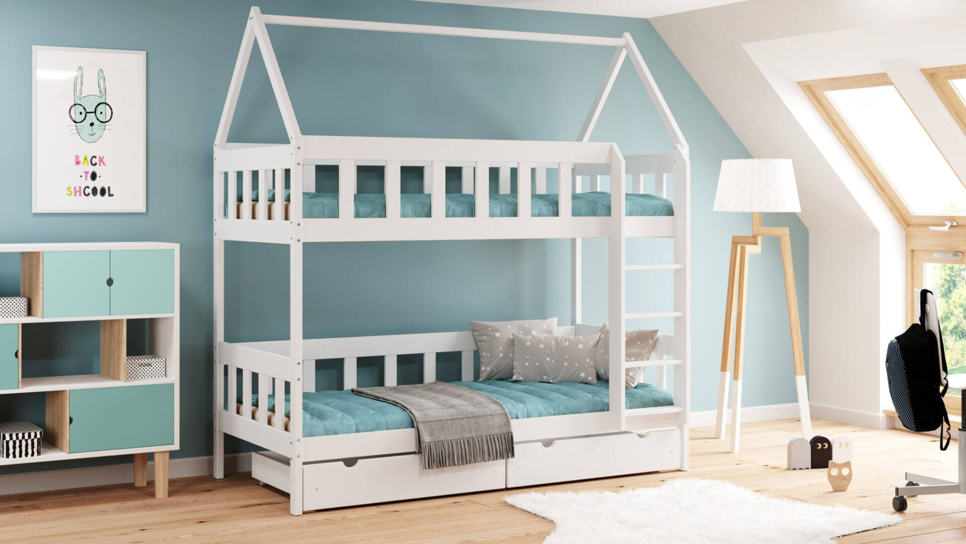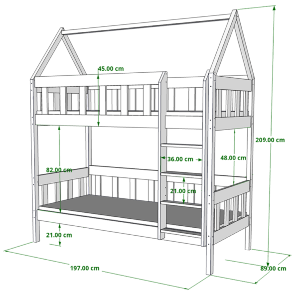 Łóżko piętrowe DOMEK CHWAT to solidna i całkowicie drewniana konstrukcja, idealna dla rodzeństwa, oferująca dodatkową przestrzeń do zabawy. Możliwość personalizacji dodatkami sprawia, że łóżko staje się wyjątkowe, a opcjonalna szuflada pozwala na przechowywanie pościeli lub zabawek.
