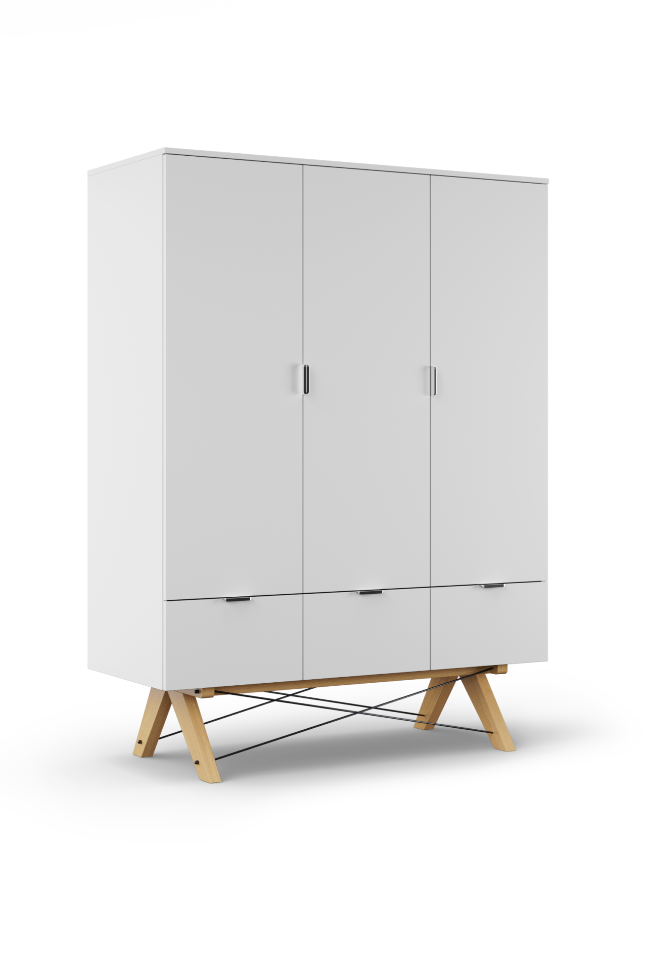 Szafa BASIC MAXI z trzema segmentami oraz funkcjonalną przestrzenią w środku to największy model z naszej oferty. Stylistyka szafy nawiązuje swoim wyglądem do skandynawskich wnętrz. Prosta bryła szafy wykończona drewnianymi elementami genialnie wpasuje się w nie ma każdą aranżację sypialni, garderoby czy przedpokoju. Szafa posiada aż 6 opcji układu wnętrza do wyboru, można wybierać spośród drążków, półek oraz szuflad do przechowywania.