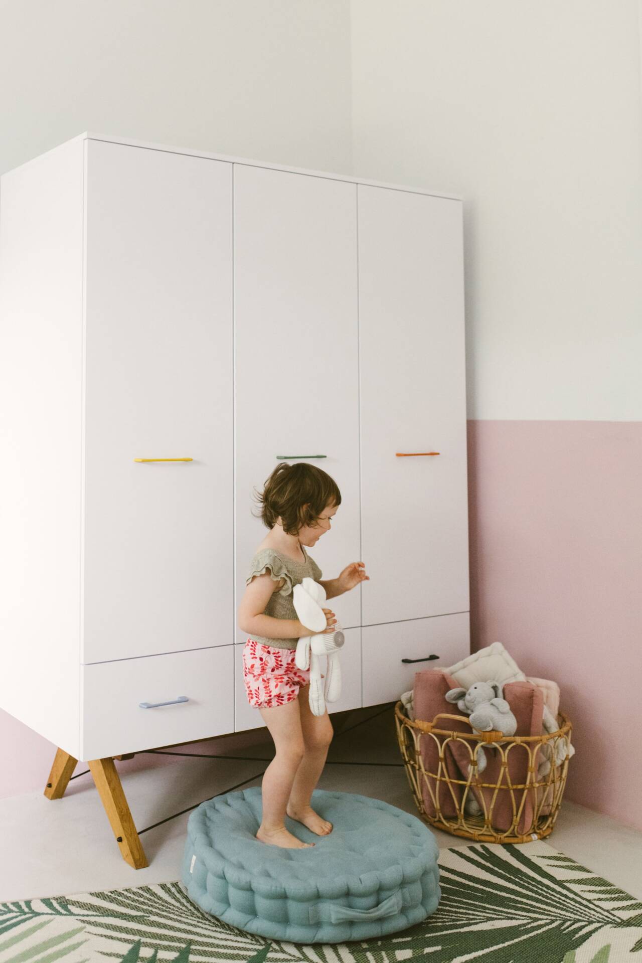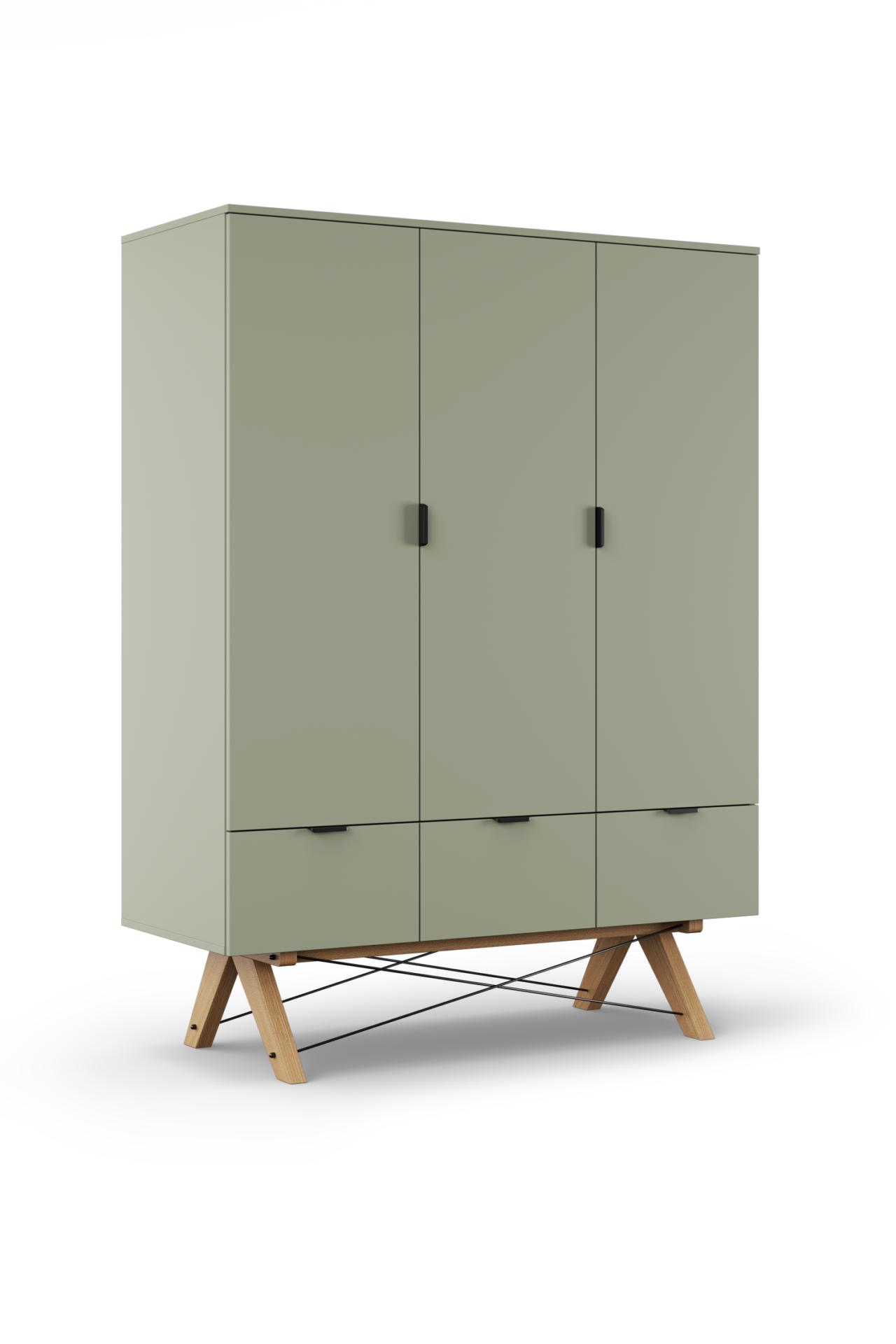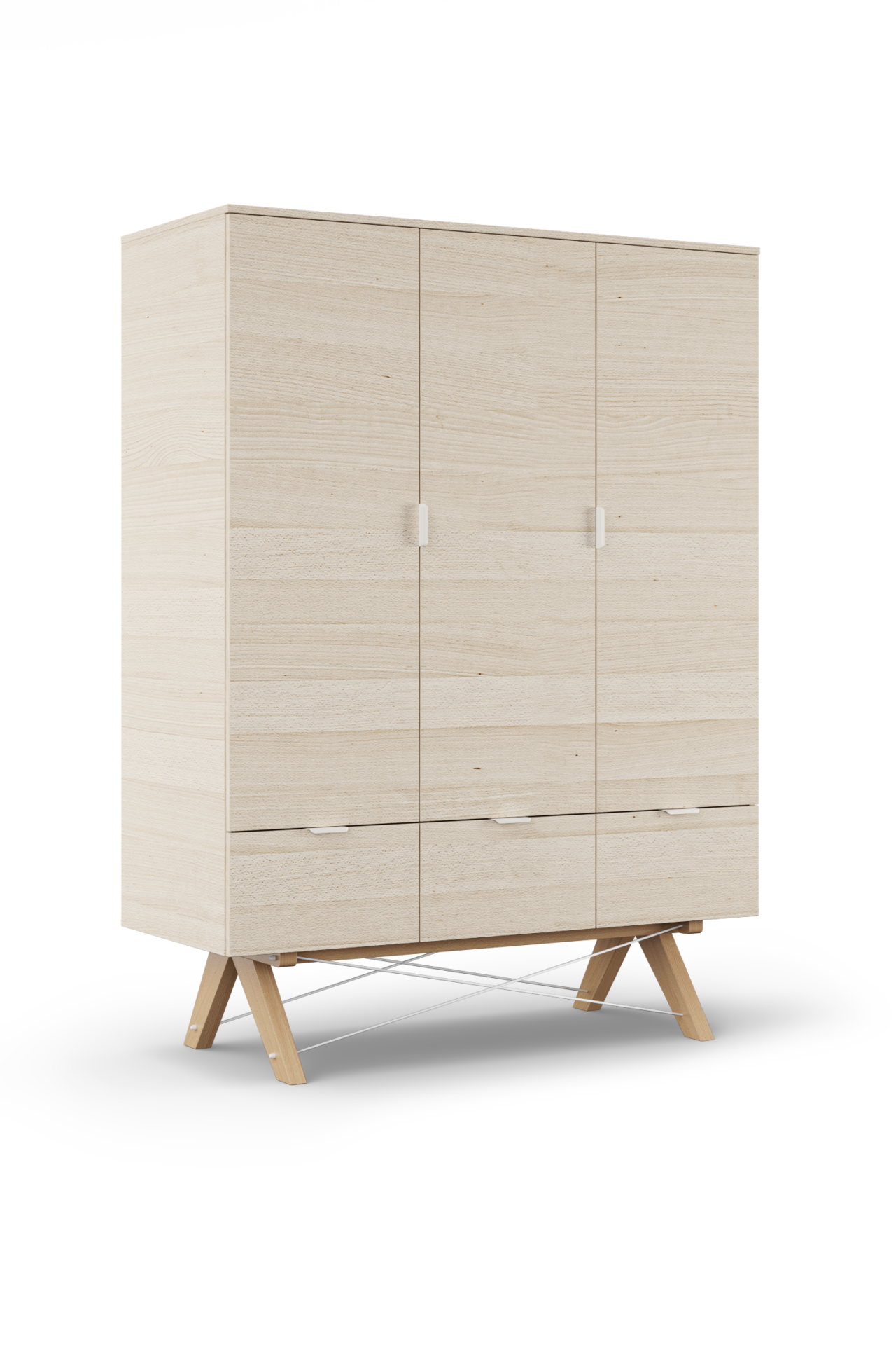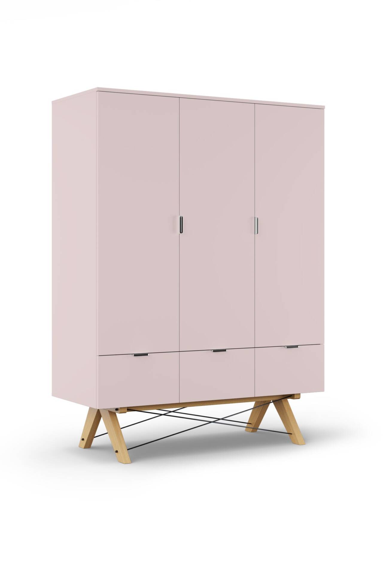 Szafa usadowiona została na drewnianych nóżkach spiętych metalowymi drucikami, które dodatkowo zdobią mebel. Szafa do sypialni czy pokoju dziecka, z rodzinnej manufaktury mebli MINKO posiada drewniany stelaż meblowy wzmacniany stalą. Dzięki temu ręcznie robiona szafa prezentuje się delikatnie, ale pozostaje przy tym mocna i stabilna.
