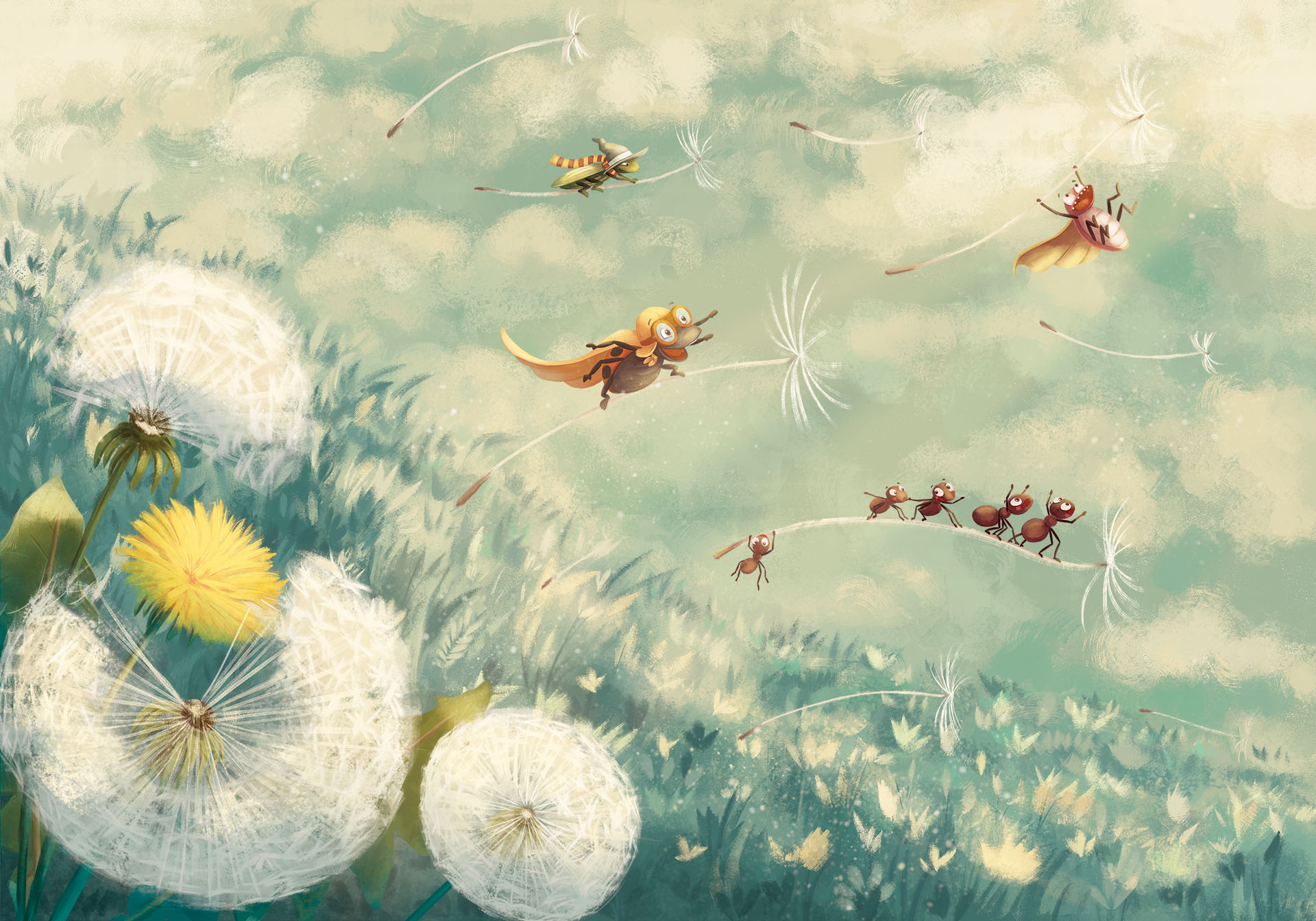 Wiatr rozwiał nasiona dmuchawca, a przeróżne robaczki skrzętnie je wykorzystały surfując na nich, niczym na falach lub lecąc, jak na miotle. W zastosowaniu latających nasion ogranicza je tylko ich fantazja.